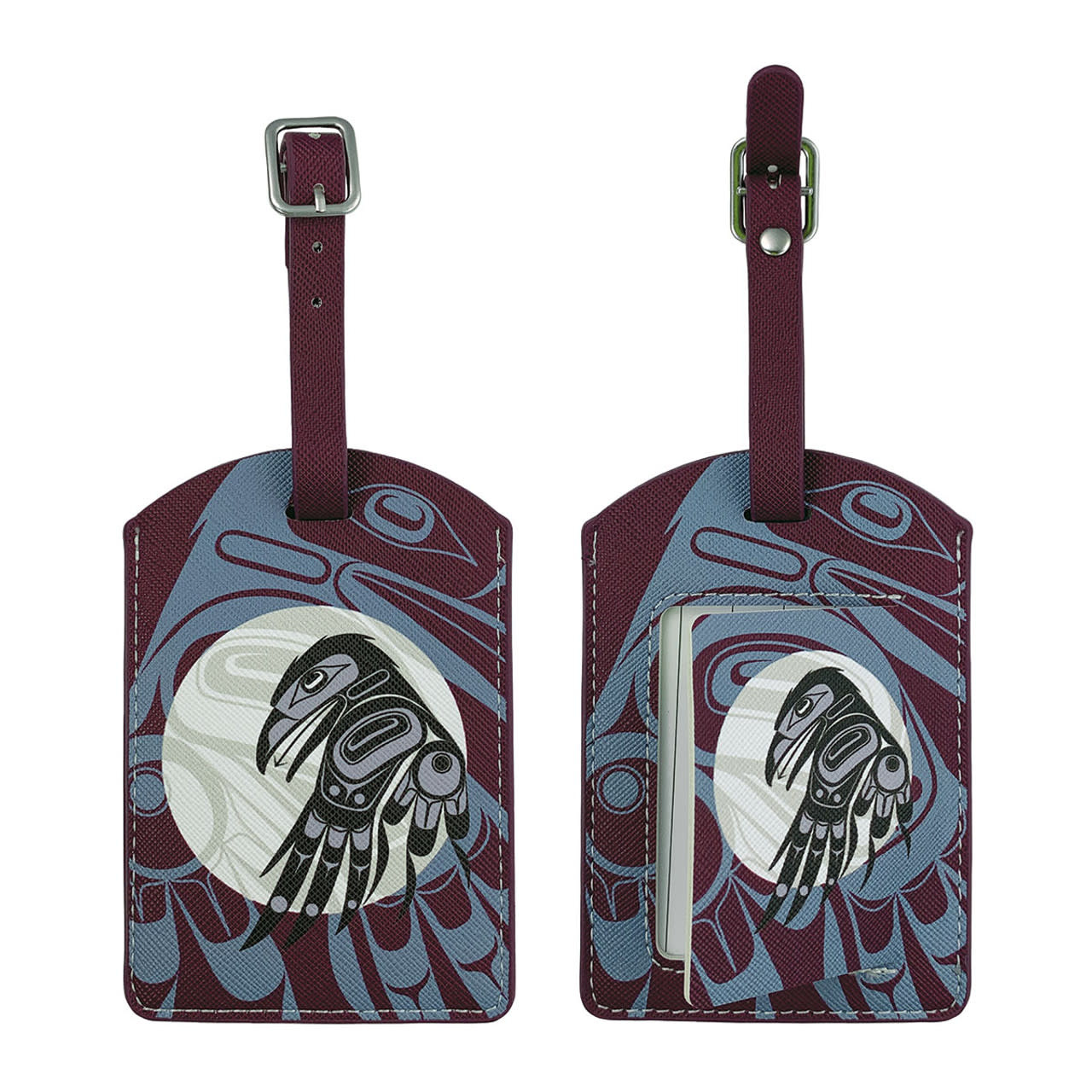 Travel in style while showcasing Indigenous art and culture with Native Northwest Luggage Tags. Made from 100% vegan leather, these durable tags feature art designs by celebrated Indigenous artists. The privacy flap on the back ensures that your personal information stays protected. With a 3" x 4.325" tag and a 3" strap, spotting your luggage has never been easier.
